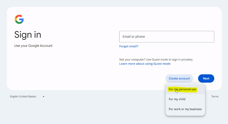 - Click on "Create account" and choose "For my personal use" to start on creating a Google account.
